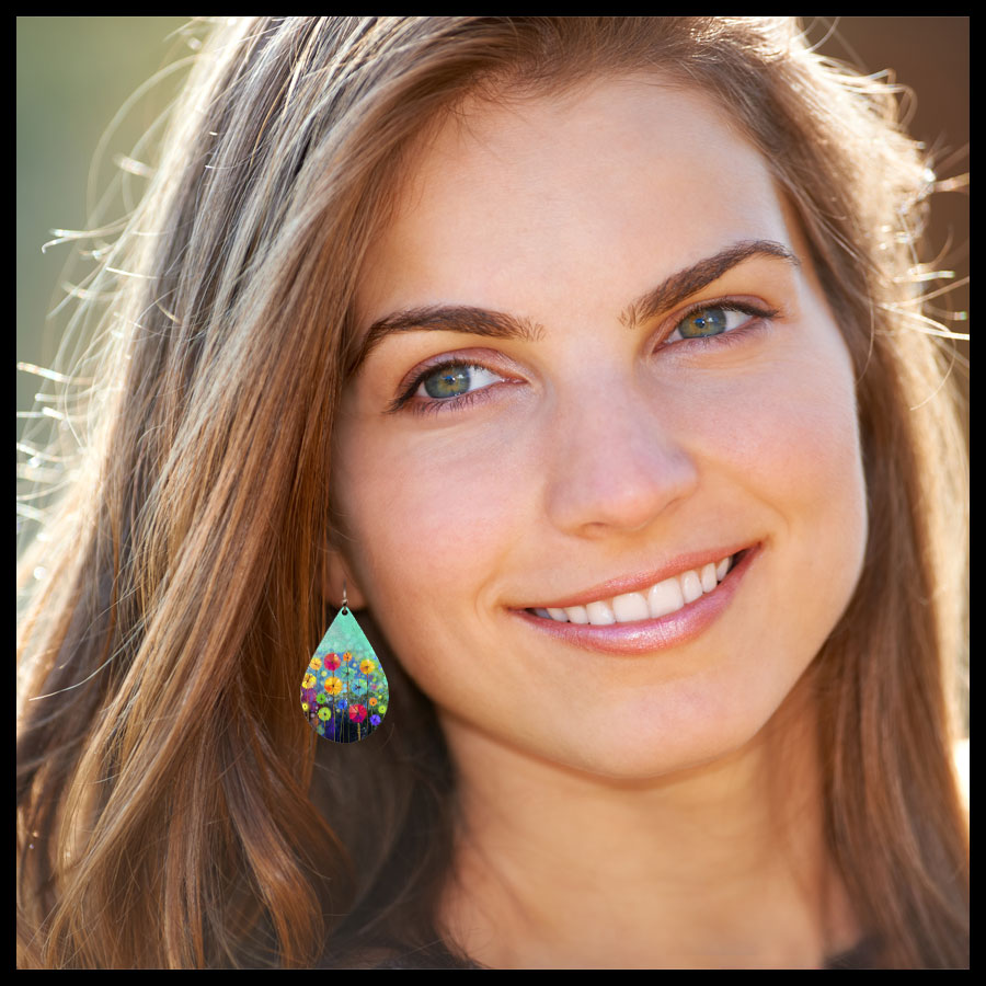 Our very stylish earrings are ultra-light weight & water resistant. Each earring is a handcrafted UV giclée printed both sides on stainless steel. We use hypoallergenic, antique copper ear wires. Sku: 27NXB