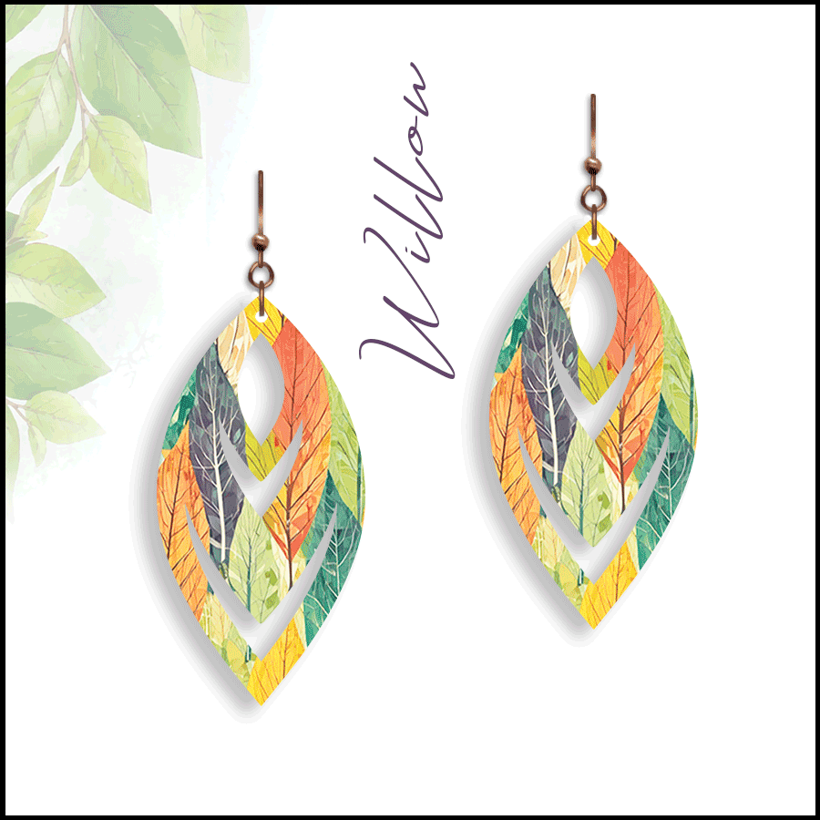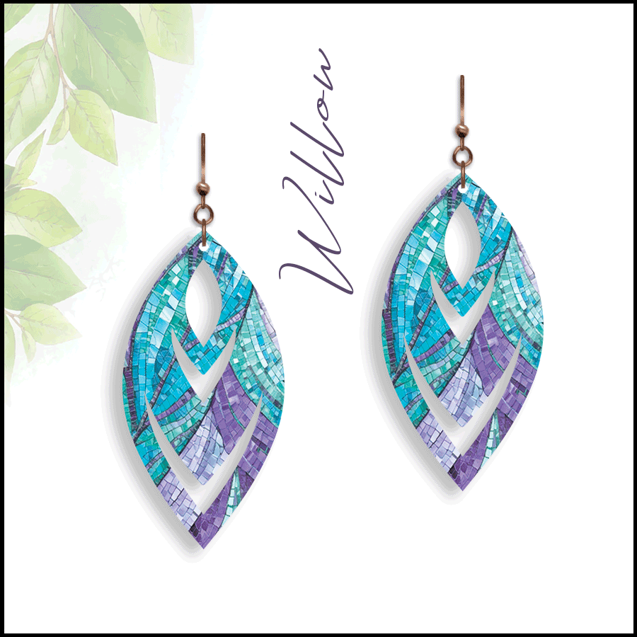 Our very stylish earrings are ultra-light weight & water resistant. Each earring is a handcrafted UV giclée printed on solid Mahogany wood. We use hypo-allergenic, antique copper ear wires. Wood dimensions: .75″ x 1.5″. Total dangle length: 2.25″ SKU: A64